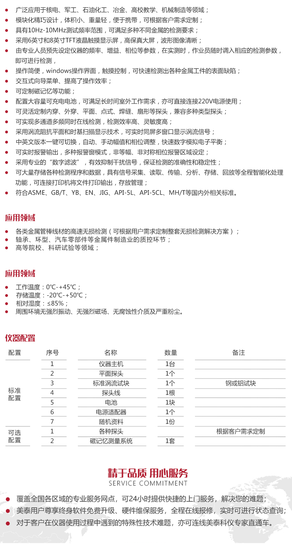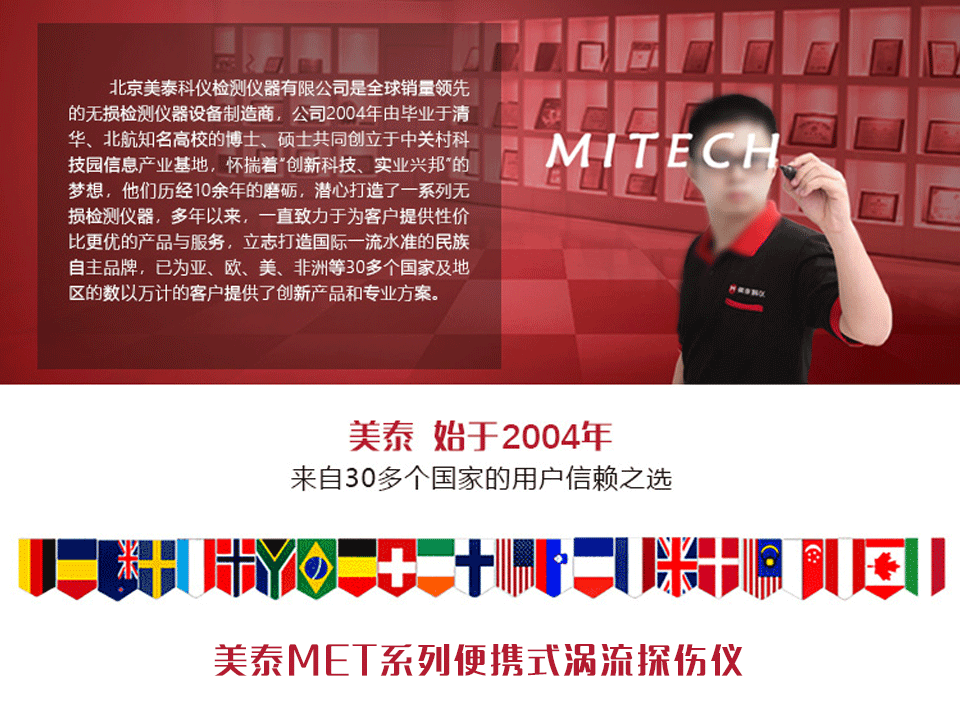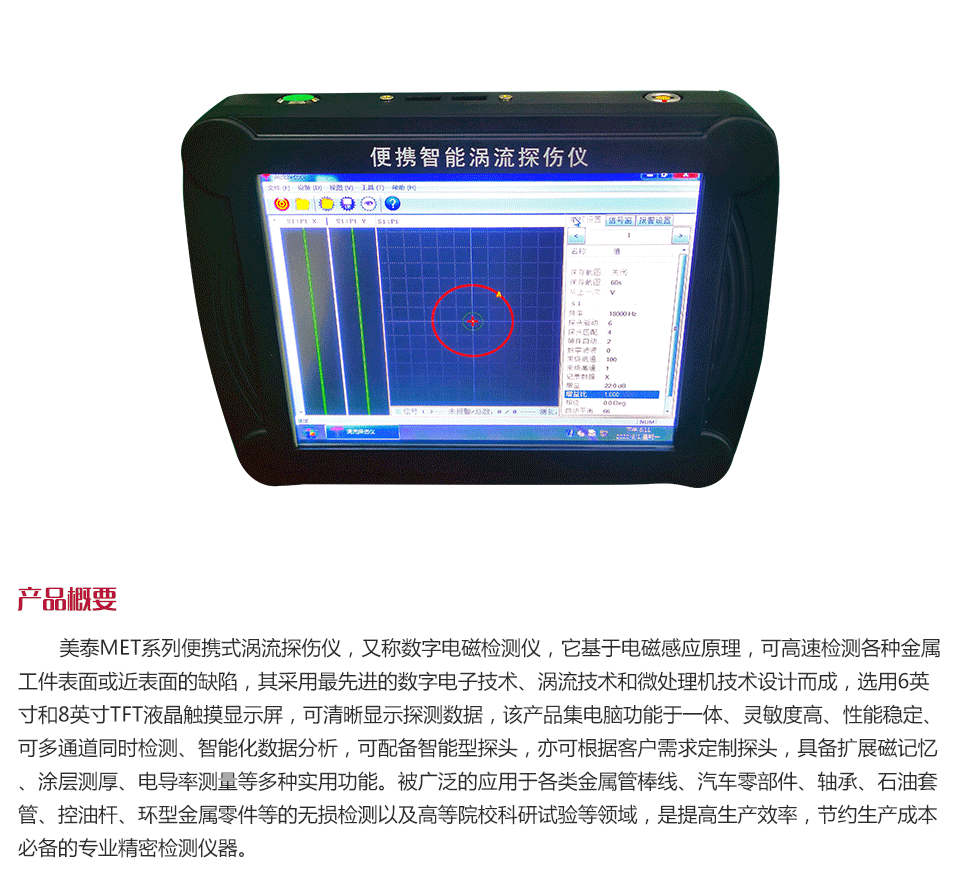 產(chǎn)品概述美泰MET系列便攜式渦流探傷儀,又稱數(shù)字電磁檢測儀,它基于電磁感應(yīng)原理,可高速檢測各種金屬工件表面或近表面的缺陷,其采用最先進(jìn)的數(shù)字電子技術(shù)、渦流技術(shù)和微處理機(jī)技術(shù)設(shè)計而成,選用6英寸和8英寸TFT液晶觸摸顯示屏,可清晰顯示探測數(shù)據(jù),該產(chǎn)品集電腦功能于一體、靈敏度高、性能穩(wěn)定、可多通道同時檢測、智能化數(shù)據(jù)分析,可配備智能型探頭,亦可根據(jù)客戶需求定制探頭,具備擴(kuò)展磁記憶、涂層測厚、電導(dǎo)率測量等多種實用功能。被廣泛的應(yīng)用于各類金屬管棒線、汽車零部件、軸承、石油套管、控油桿、環(huán)型金屬零件等的無損檢測以及高等院??蒲性囼灥阮I(lǐng)域,是提高生產(chǎn)效率,節(jié)約生產(chǎn)成本必備的專業(yè)精密檢測儀器。