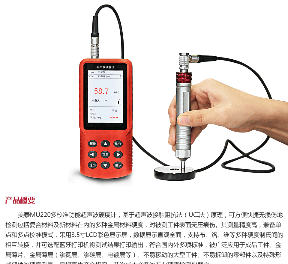 產(chǎn)品概述 美泰MU220多校準(zhǔn)功能超聲波硬度計(jì),基于超聲波接觸阻抗法(UCI法)原理,可方便快捷無損傷地檢測(cè)包括復(fù)合材料及新材料在內(nèi)的多種金屬材料硬度,對(duì)被測(cè)工件表面無壓痕傷。其測(cè)量精度高,兼?zhèn)鋯吸c(diǎn)和多點(diǎn)校準(zhǔn)模式,采用3.5寸LCD彩色顯示屏,數(shù)據(jù)顯示直觀全面,支持布、洛、維等多種硬度制氏間的相互轉(zhuǎn)換,并可選配藍(lán)牙打印機(jī)將測(cè)試結(jié)果打印輸出,符合國內(nèi)外多項(xiàng)標(biāo)準(zhǔn),被廣泛應(yīng)用于成品工件、金屬薄片、金屬薄層(滲氮層、滲碳層、電鍍層等)、不易移動(dòng)的大型工件、不易拆卸的零部件以及特殊形狀部件的硬度測(cè)量,是提高生產(chǎn)合格率、節(jié)約成本必備的專業(yè)精密檢測(cè)儀器之一。