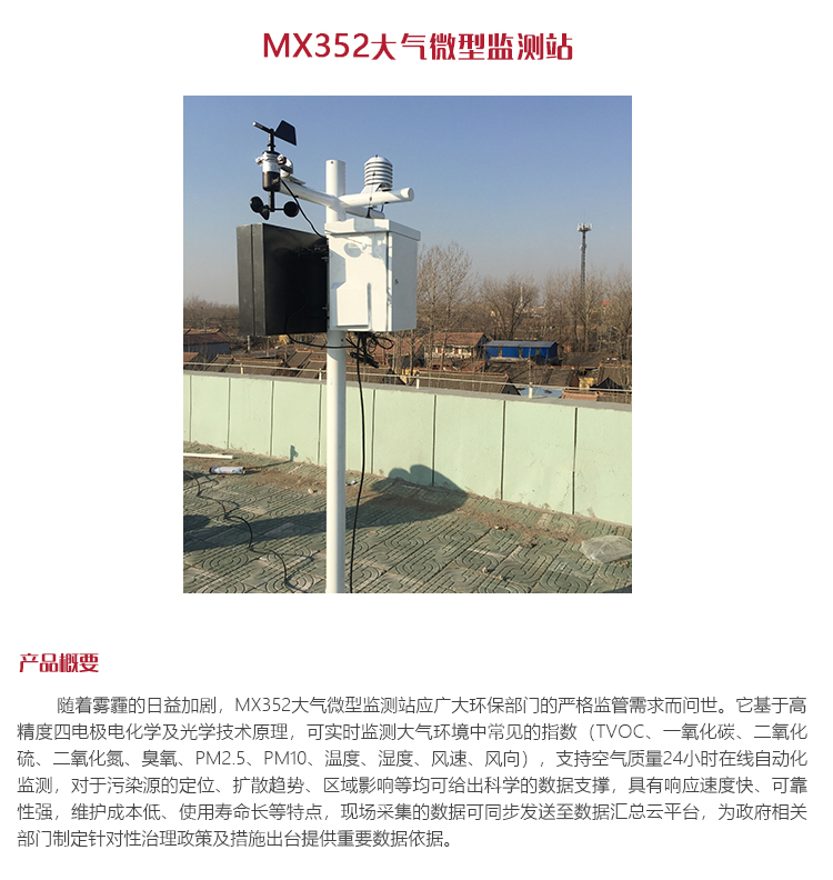 產(chǎn)品概述隨著霧霾的日益加劇,MX352大氣微型監(jiān)測(cè)站應(yīng)廣大環(huán)保部門的嚴(yán)格監(jiān)管需求而問(wèn)世。它基于高精度四電極電化學(xué)及光學(xué)技術(shù)原理,可實(shí)時(shí)監(jiān)測(cè)大氣環(huán)境中常見的指數(shù)(TVOC、一氧化碳、二氧化硫、二氧化氮、臭氧、PM2.5、PM10、溫度、濕度、風(fēng)速、風(fēng)向),支持空氣質(zhì)量24小時(shí)在線自動(dòng)化監(jiān)測(cè),對(duì)于污染源的定位、擴(kuò)散趨勢(shì)、區(qū)域影響等均可給出科學(xué)的數(shù)據(jù)支撐,具有響應(yīng)速度快、可靠性強(qiáng),維護(hù)成本低、使用壽命長(zhǎng)等特點(diǎn),現(xiàn)場(chǎng)采集的數(shù)據(jù)可同步發(fā)送至數(shù)據(jù)匯總云平臺(tái),為政府相關(guān)部門制定針對(duì)性治理政策及措施出臺(tái)提供重要數(shù)據(jù)依據(jù)。